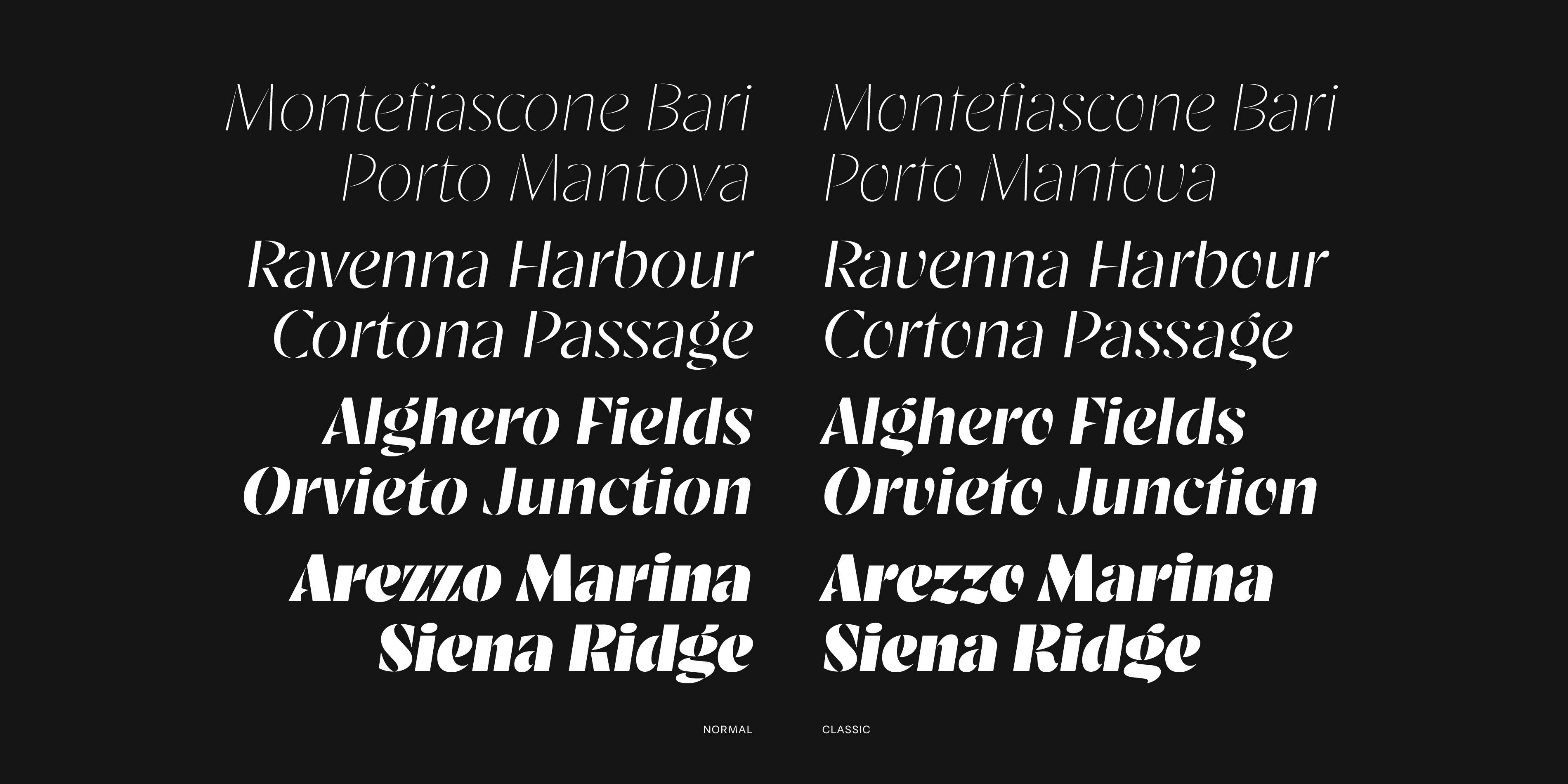 The result is a variable typeface built around two primary axes: Weight and Classic. The Weight axis extends the distinctive spirit of the original heavy stencil into a wider range of typographic possibilities. While the historical version existed only as a single bold weight, expanding the spectrum reveals how the design behaves under different levels of visual pressure. In lighter weights the stencil interruptions become more delicate, emphasizing the geometric skeleton of the letters. As the weight increases, the forms gain density and impact, returning to the bold presence that defines the original specimen. The Classic axis introduces a different kind of exploration. Rather than changing the weight of the strokes, this axis adjusts the relationship between the revival and the historical source. At one end the design stays close to the proportions and construction observed in the original specimen. At the other the forms evolve toward a more contemporary interpretation.
